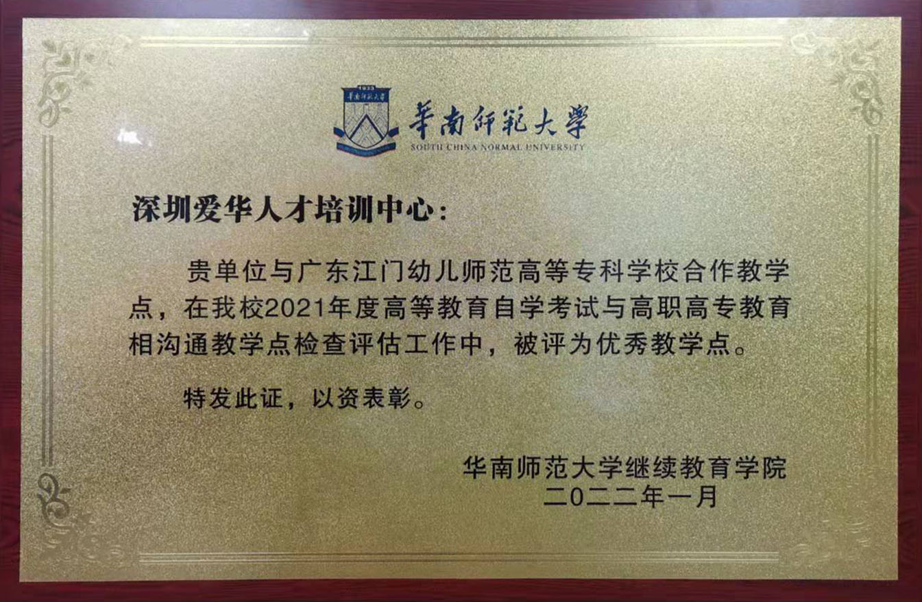 根据《关于开展华南师范大学自学考试相沟通(第二学历)2021年度教学点评估的通知》要求,华南师范大学教育学院开展2021年度相沟通合作教学点考核评优工作。综合招生宣传、招生规模、教务教学管理、学生管理、等方面考量,深圳爱华人才培训中心与广东江门幼儿师范高等专科学校合作教学点考核结果优异,被评为2021年度优秀教学点。